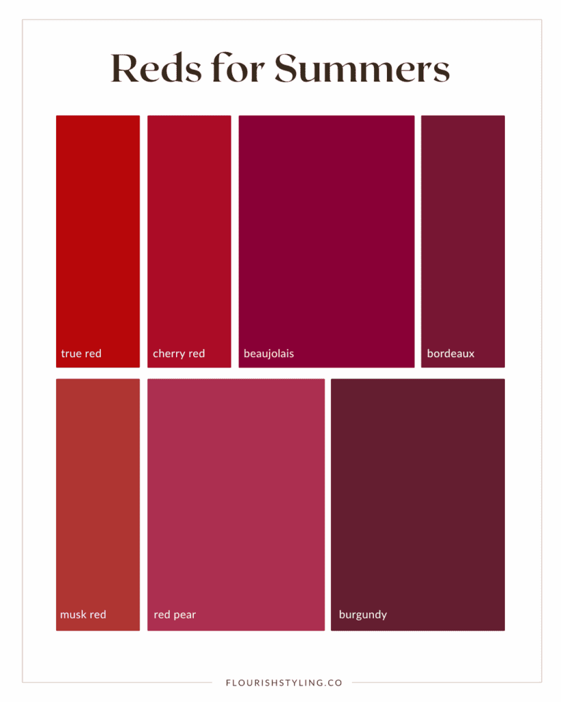 Most of the reds in the Summer palette gravitate towards the burgundy end of the spectrum. Summers have cherry red, a classic, slightly cooler version of true red. It’s what we think of when we picture iconic 50s era pin-up gals or cherry-flavored candy. There is also musk red and cranberry, which you can see are more muted and cooler in tone than true red. The darker reds you see in this palette are darker without being heavy, and in our opinion, super sensual. With undertones of blue, they are not warm whatsoever.