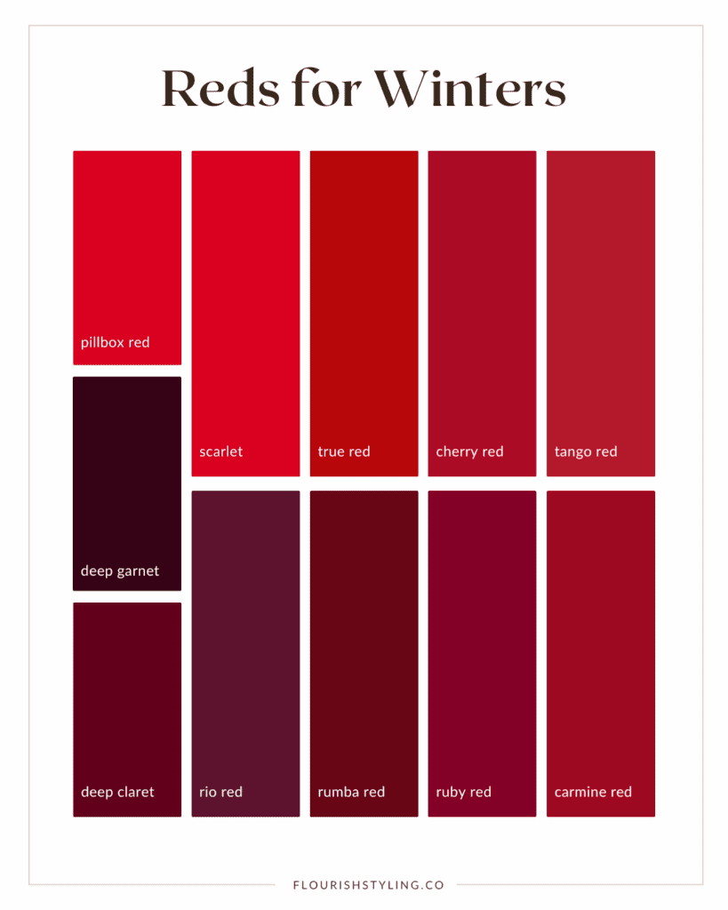 Winters have a little bit of crossover as well. In their palette, they have cherry red and mars red, which we have seen for Summers and Autumns. But they also have tango, carmine, and ruby, which get progressively deeper while still retaining their cool tone. These reds have much more blue undertones. Even though they do have depth to them, these colors are clear and bright, as if you can see straight through them.